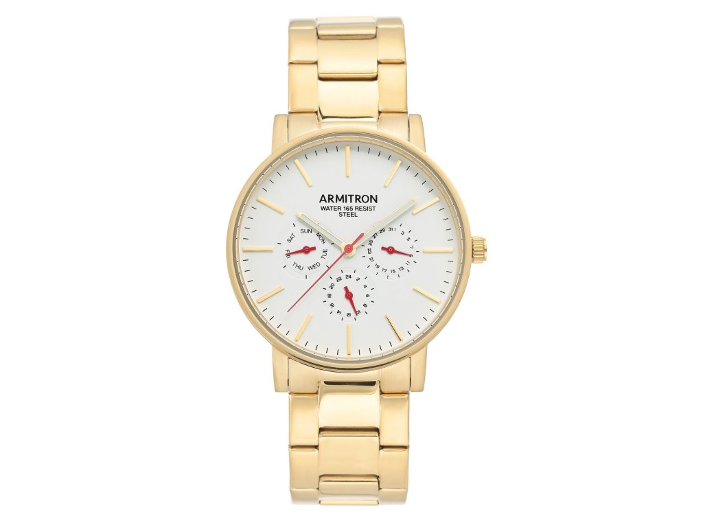 Multifunkční pánské hodinky Armitron ve zlaté barvě, které neztrácejí na eleganci. Malé indexy na bílém číselníku zobrazují jak den, tak datum a hodiny. Doplněné jsou velkými stříbrnými indexy se sekundovkou. Zlatý pásek je nastavitelný, hodinky jsou voděodolné a chráněné mineráním sklíčkem.Doplňkové parametry
