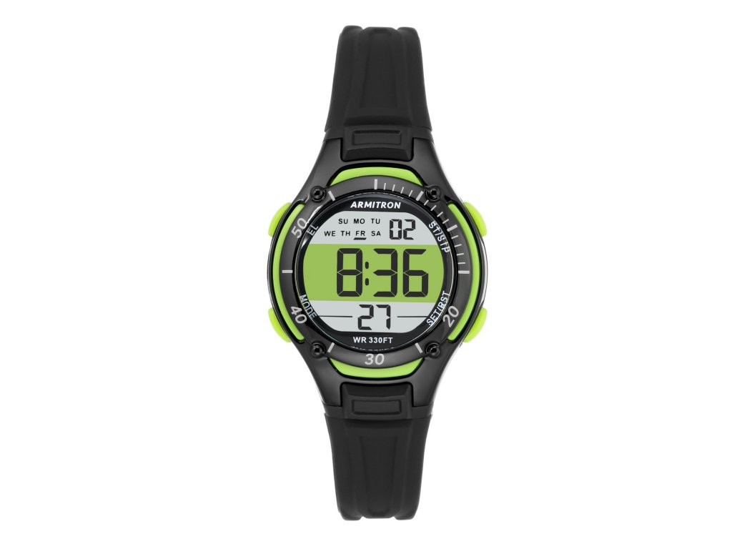 Dámské sportovní hodinky Armitron s kulatým displejem, černým páskem, limetkovými tóny a mnoha funkcemi.Doplňkové parametry