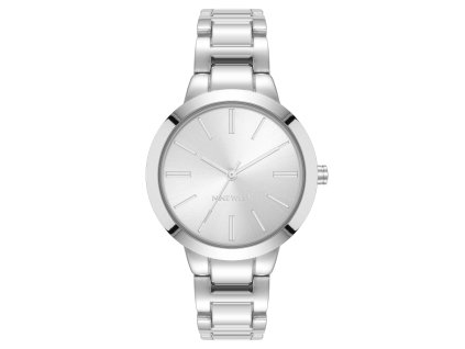 Dámské hodinky Nine West v celostříbrném provedení s kovovým tahem a číselníkem bez číslic....