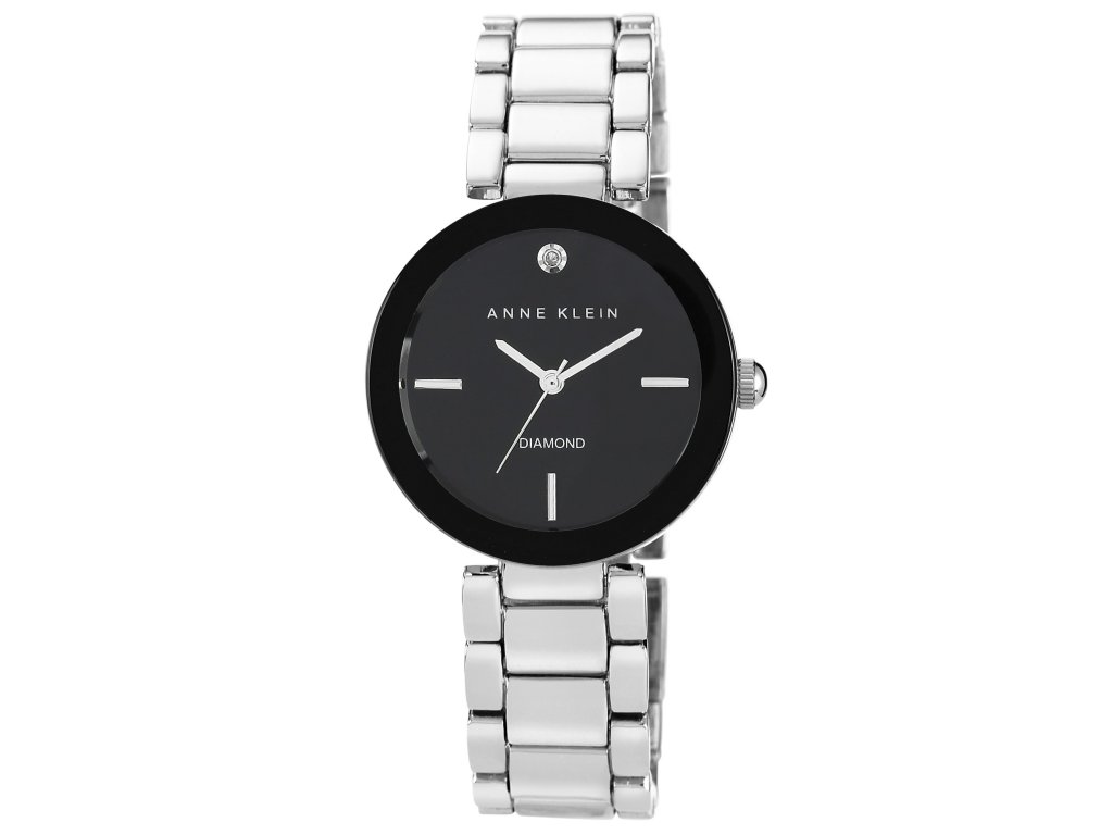 Dámské náramkové hodinky z obecného kovu bez obsahu niklu ve stříbrné barvě, náramek je stejné barvy a stejného materiálu. Hodinky zdobí černá luneta a černý číselník na němž se vyjímá pravý diamant. Vodotěsnost 30M.Doplňkové parametry