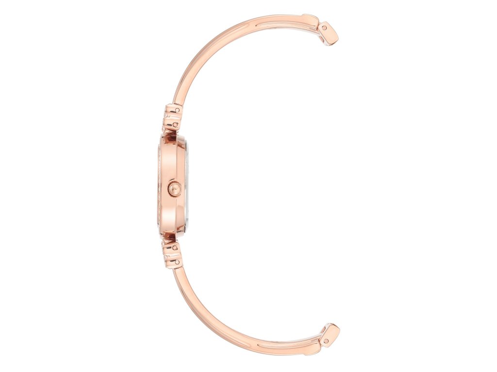 Dámské náramkové hodinky z obecného kovu bez obsahu niklu. Hodinky jsou prodáváné v setu se 3 náramky. Pouzdro i náramky jsou v barvě růžového zlata. Číselník je v barvách ruměncové perleti a lunetu zdobí krystaly. Ostatní 2 náramky jsou zdobeny krystaly a třetí barvou ruměncového smaltu.Doplňkové parametry