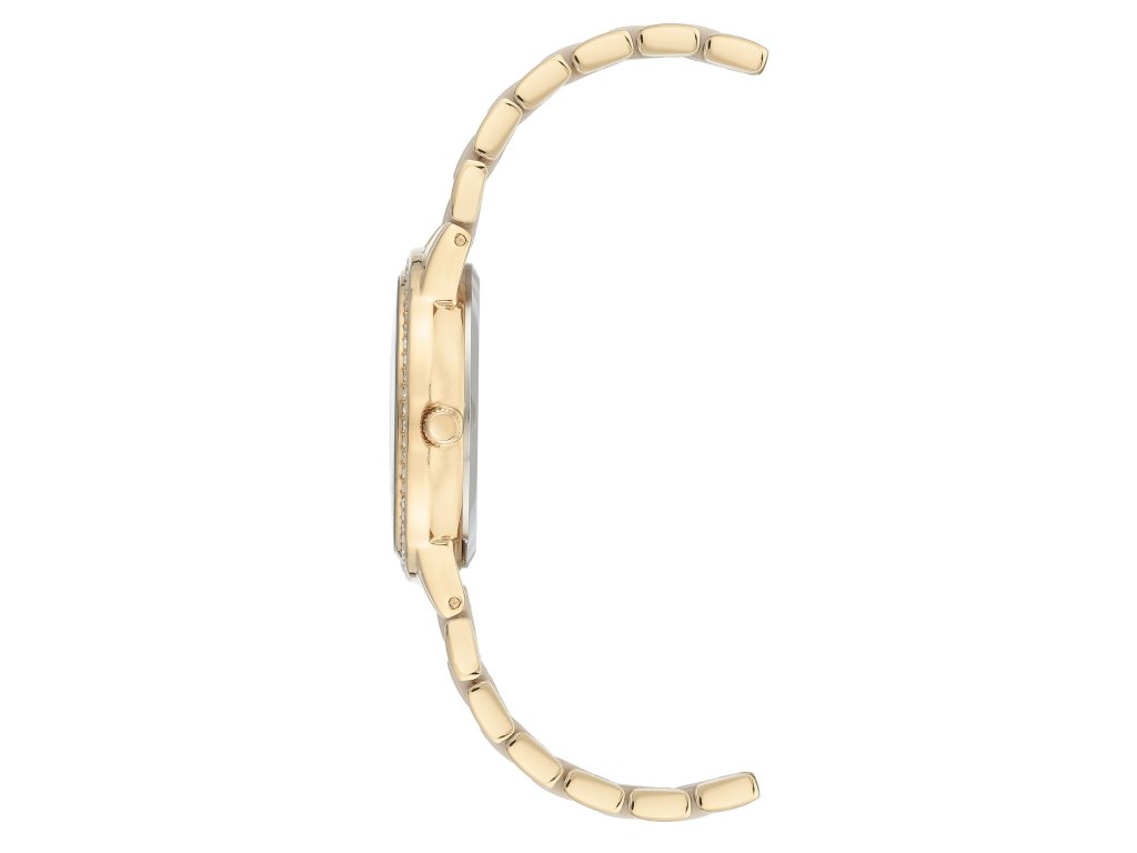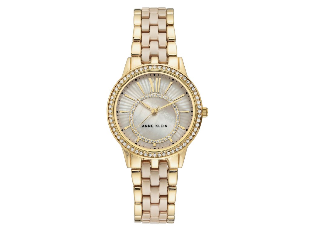 Dámské náramkové hodinky z obecnéh kovu bez obsahu niklu. Pouzdro i náramek jsou v barvách zlata. Číselník v tónované perleti zdobí krystaly, které zároveň zkrášlují lunetu. Náramek je v kombinaci s tónovanou keramikou. Vodotěsnost 30M.Doplňkové parametry
