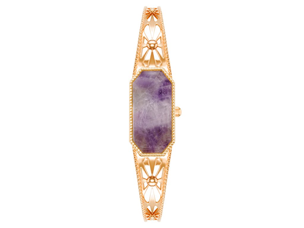 Design dekorovaného kovového náramku je u hodinek velmi netradiční, avšak jeho růžovozlatý tón skvěle ladí s pouzdrem, kde se pod fialovým kamenem ukrývá číselník, zdobený jemnými zlatavými ručkami a decentními indexy. Tento design vytváří harmonický a sofistikovaný vzhled, který nikdy nevyjde z módy.