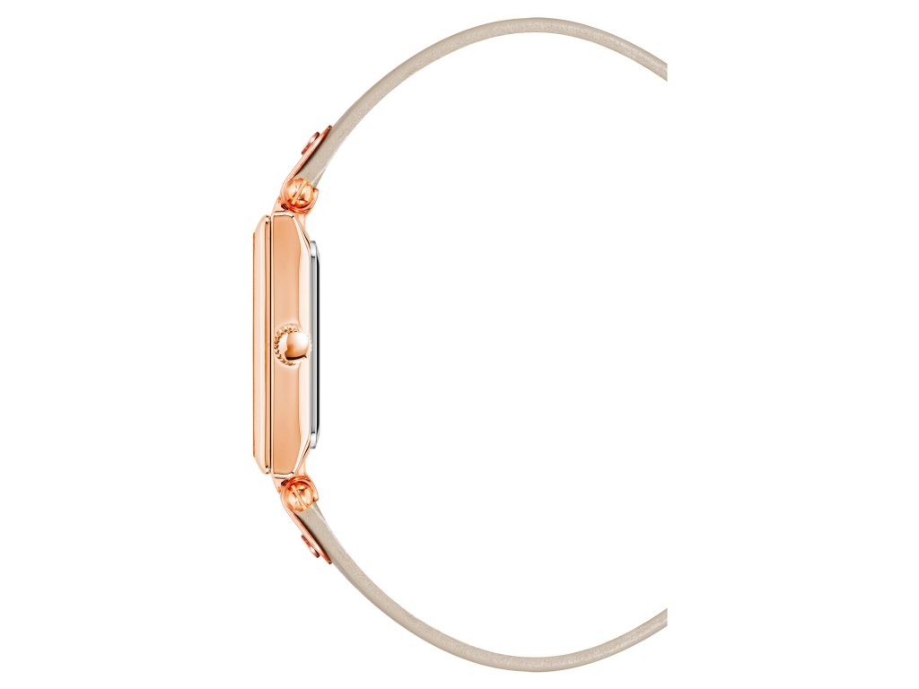 Model má bicolor kožený řemínek s kombinací světlé a růžově zlaté barvy, který ladí s hranatým pouzdrem v růžově zlatém provedení a jemným béžovým číselníkem. Ten je čistý a přehledný, bez rušivých prvků, ideální pro minimalistický styl. Minerální sklo chrání hodinky před poškrábáním a strojek Quartz se stará o přesný a spolehlivý chod. Perfektní volba pro ženy, které dávají přednost originálním, ale decentním doplňkům.