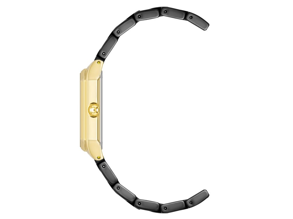 Model má černý keramický řemínek a hranaté pouzdro ve zlaté barvě, které tvoří luxusní kontrast s čistým černým číselníkem a diamantovým detailem. Keramika dodává hodinkám mimořádnou odolnost i komfort při nošení. Minerální sklo chrání číselník před poškrábáním a strojek Quartz zajišťuje přesný chod. Ideální volba pro ženy, které vyhledávají výjimečný design, prémiové zpracování a nadčasovou eleganci.