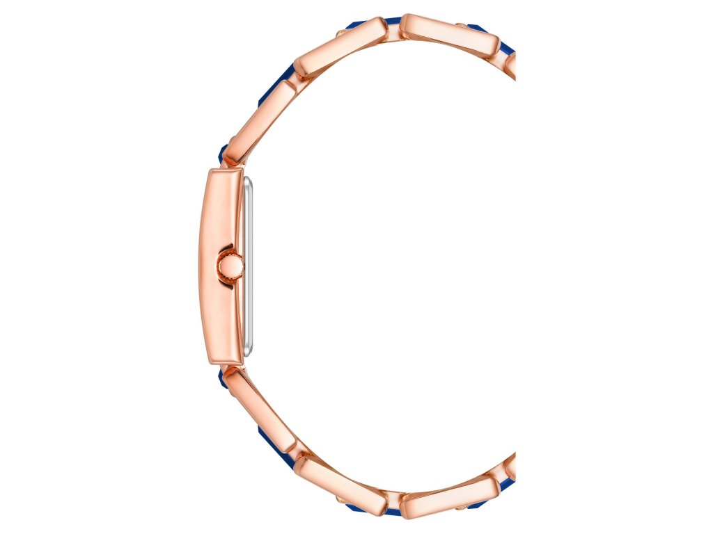 Propracovaný tah složený z dvou řad kovových článku v růžovozlaté barvě po stranách a jedné řady článků v modré barvě uprostřed se vyznačuje jemným leskem a přepychovým vzhledem. Hranaté pouzdro je též celé v růžovozlaté barvě. Hodinkám dodává výrazný a moderní vzhled modrý číselník. Tento úchvatný kontrast zdůrazňuje eleganci celého designu doplňku.