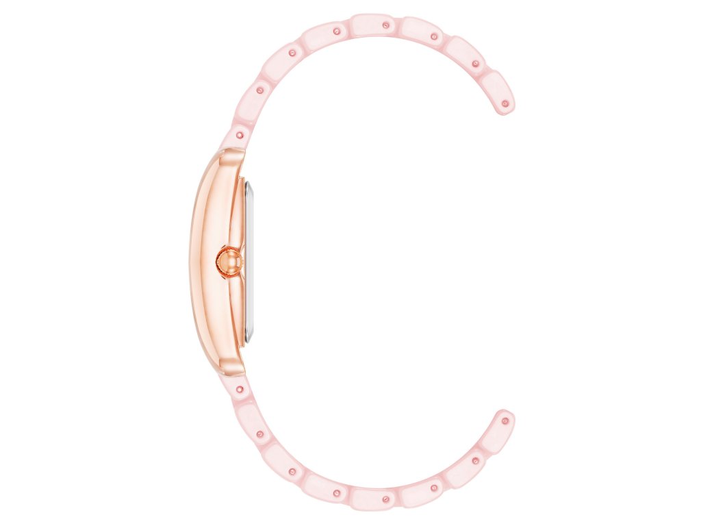 Tyto hodinky se vyznačují kovovým tahem v růžové barvě, který zajišťuje nejen odolnost, ale také hodinkám dodává něžnou estetiku. Hranaté pouzdro v růžovozlaté barvě pěkně ladí s růžovým číselníkem, na němž jemně působí ručky a indexy.