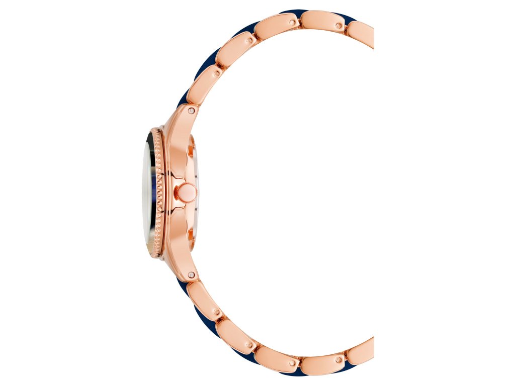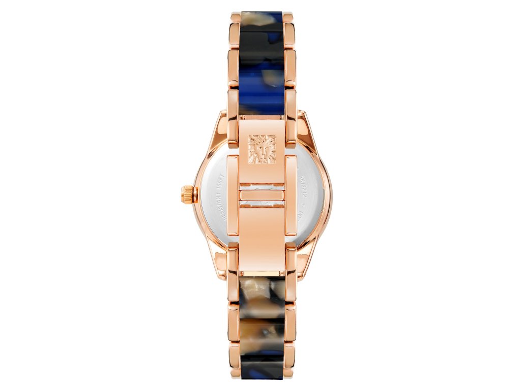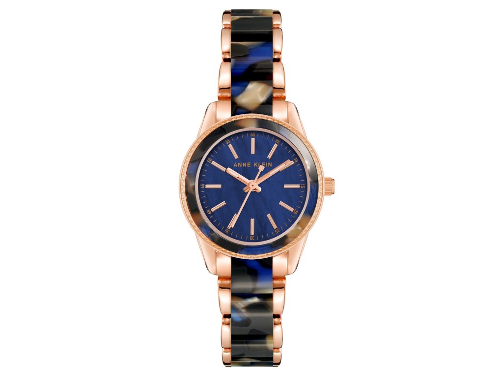 Hodinky Anne Klein spojují syté barvy a jemné kovové tóny do elegantního a výrazného celku. Modrý číselník vytváří poutavý kontrast k růžově zlatému pouzdru i detailům na tahu, čímž model působí moderně a stylově.