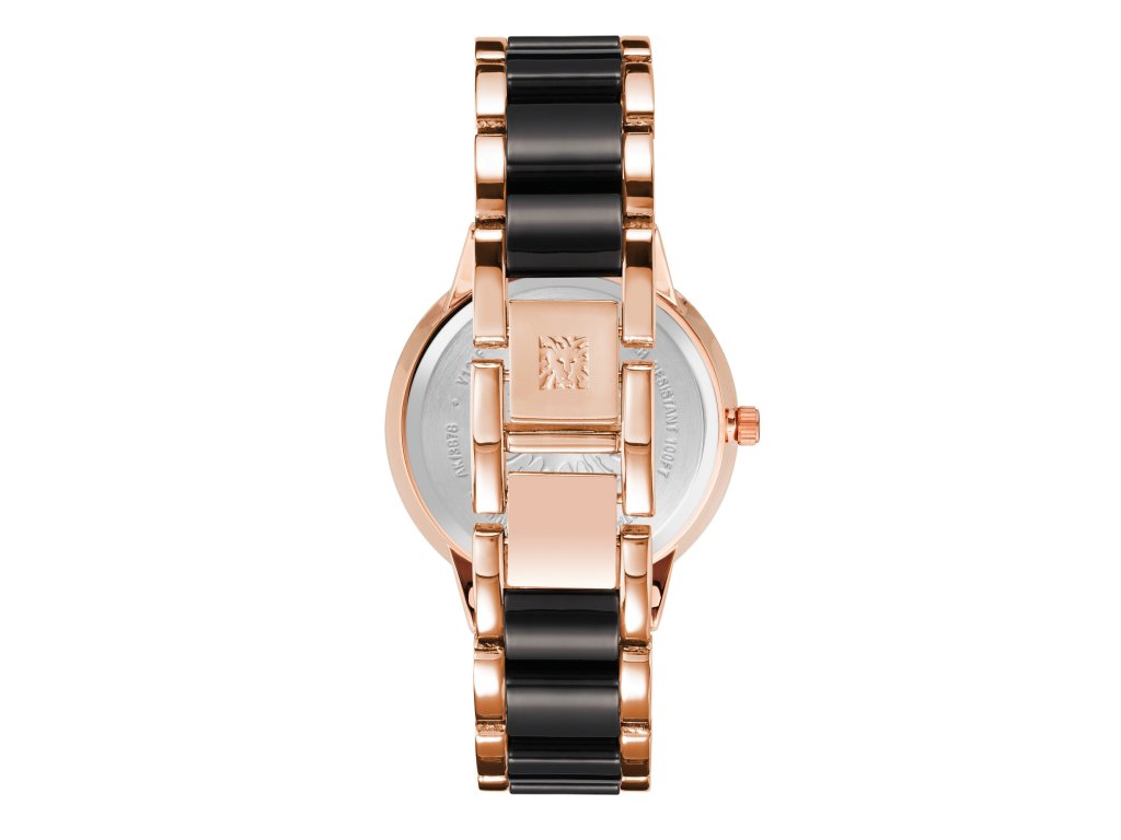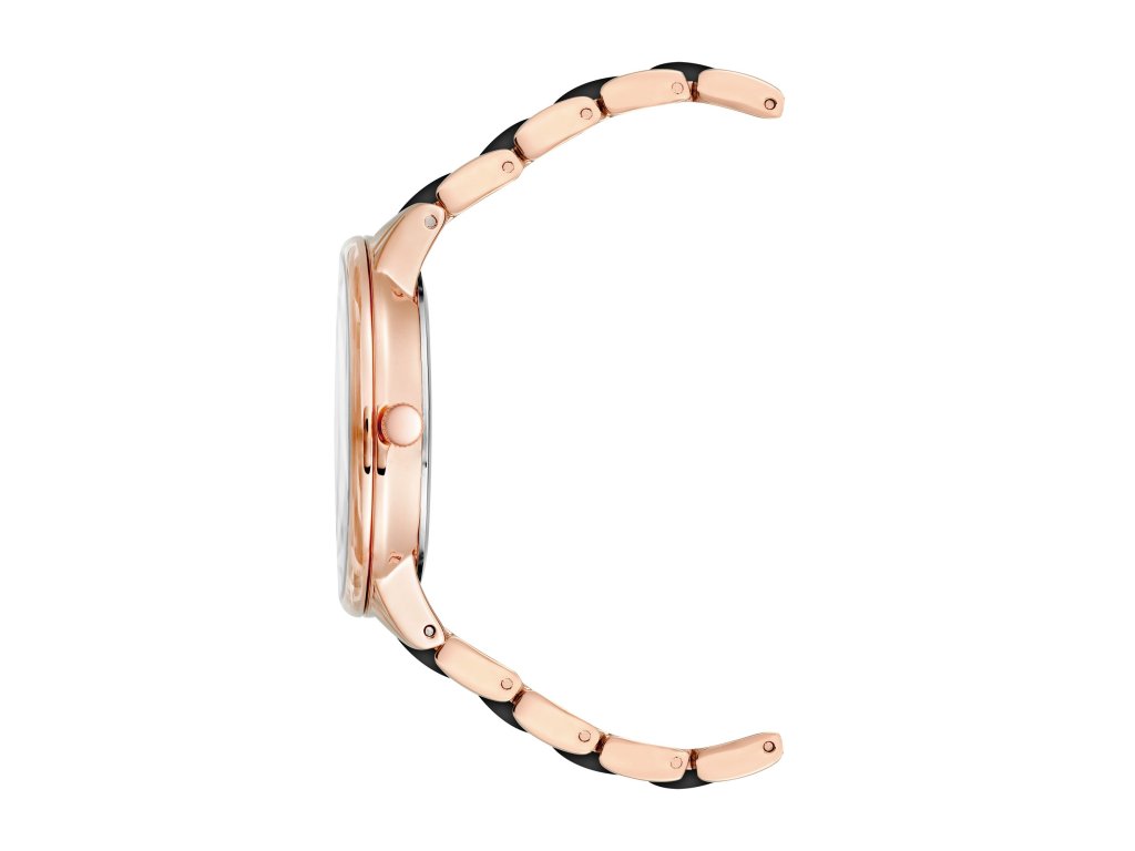 Hodinky Anne Klein působí moderně a výrazně díky kontrastnímu barevnému řešení. Černý číselník ostře kontrastuje s růžovozlatým pouzdrem a dvoubarevným tahem, což vytváří elegantní a sebevědomý vzhled.