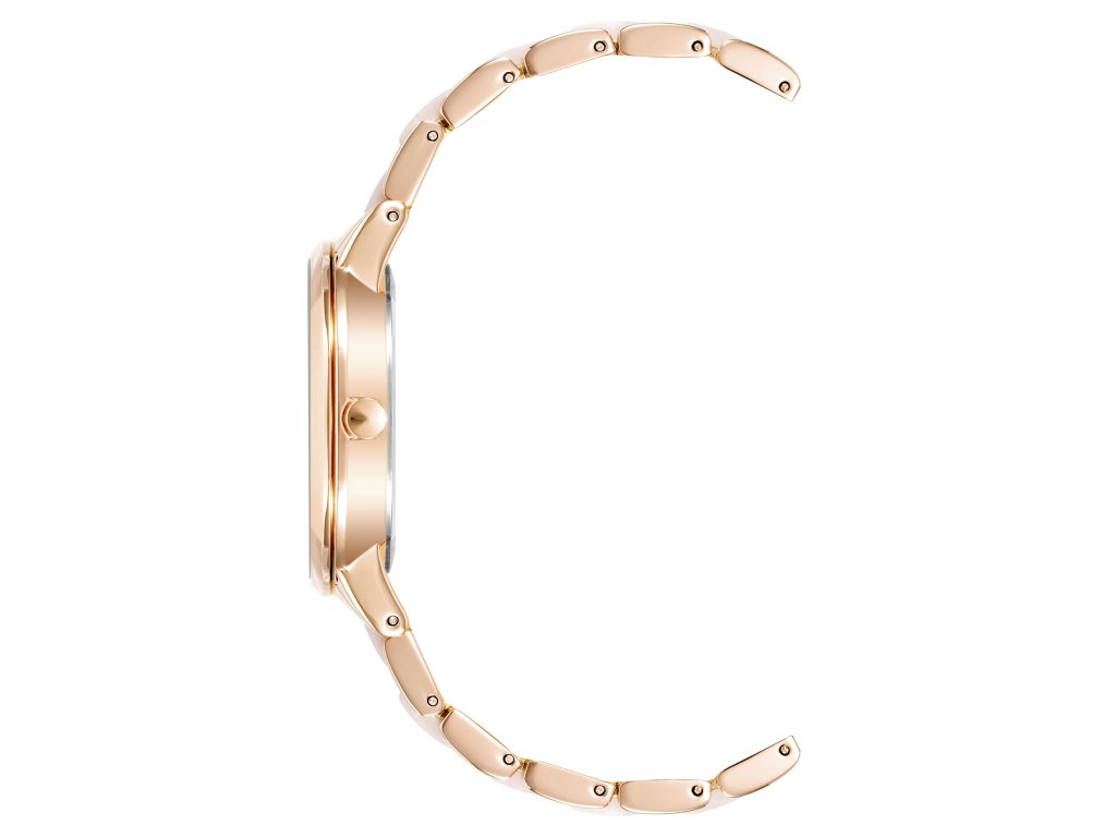 Kovový tah složený z článků růžovozlaté barvy je nejen odolný, ale také elegantní. Kulaté pouzdro stejné barvy dokonale doplňuje celkový design hodinek a dodává jim šarm. Perleťový selník o průměru 37 mm je vybaven ručkami a indexy, které zajišťují vynikající čitelnost a zároveň podtrhují estetiku hodinek. Detaily vytvářejí harmonický kontrast s podkladem a dodávají hodinkám na eleganci.