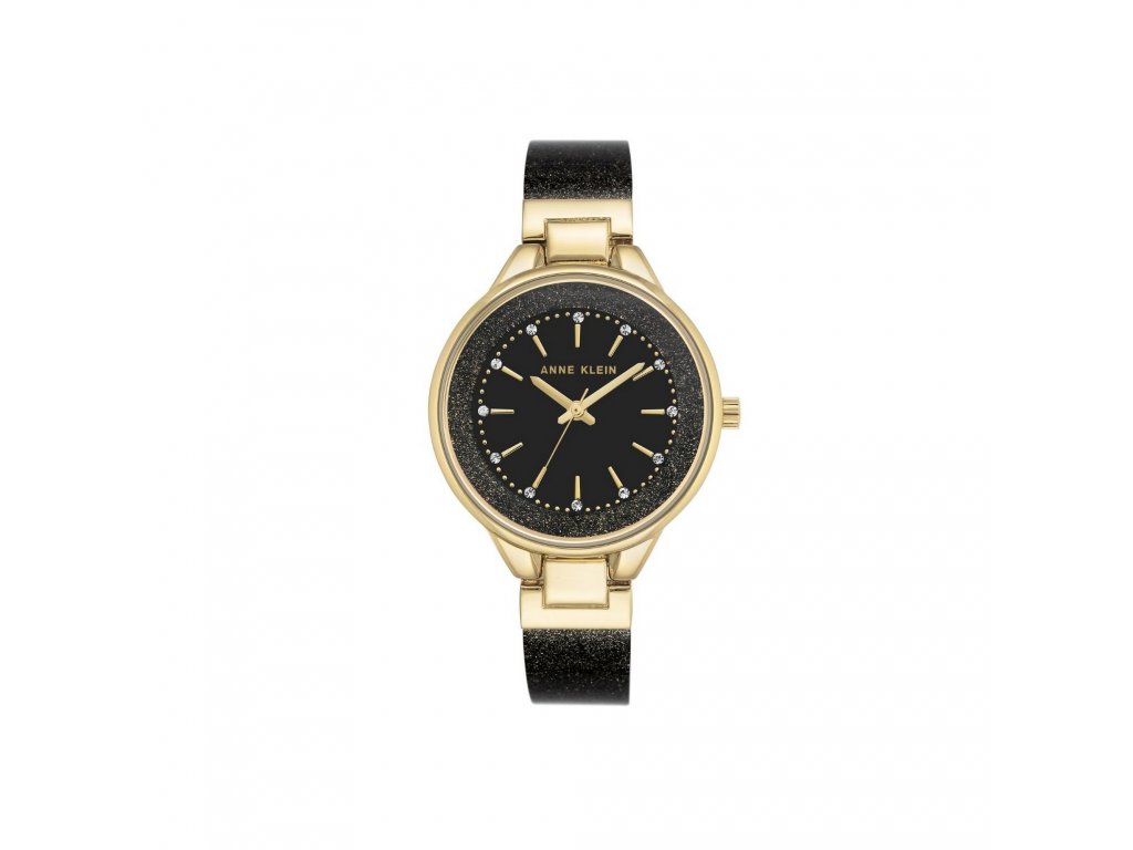 Elegantní hodinky ozdobené krystaly a pozlacenými detaily. Značka Anne Klein, nesoucí jméno známé americké vizionářky, přináší všem ženám možnost sebevyjádření pomocí něčeho tak praktického, jako jsou hodinky. Černý číselník dekorují drobné krystaly posazené na místa indexů. Pásek je tvořen kombinací pozlaceného kovu a třpytivého akrylu. Hodinky ochraňuje minerální sklo a pozlacené pouzdro o rozměru 36 mm. Snadné zapínání zajišťuje klenotnická přezka.Doplňkové parametry