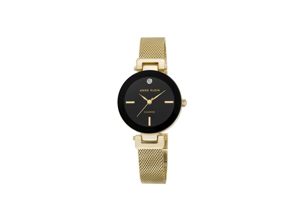 Elegantní hodinky s kovovým páskem a zlatými detaily. Značka Anne Klein, nesoucí jméno známé americké vizionářky, přináší všem ženám možnost sebevyjádření pomocí něčeho tak praktického, jako jsou hodinky. Lesklý černý číselník doplňuje drobný diamant. Hodinky ochraňuje minerální sklo a pozlacené pouzdro z chirurgické oceli o rozměru 30 mm. Snadné zapínání pozlaceného pásku zajišťuje klenotnická přezka.Doplňkové parametry