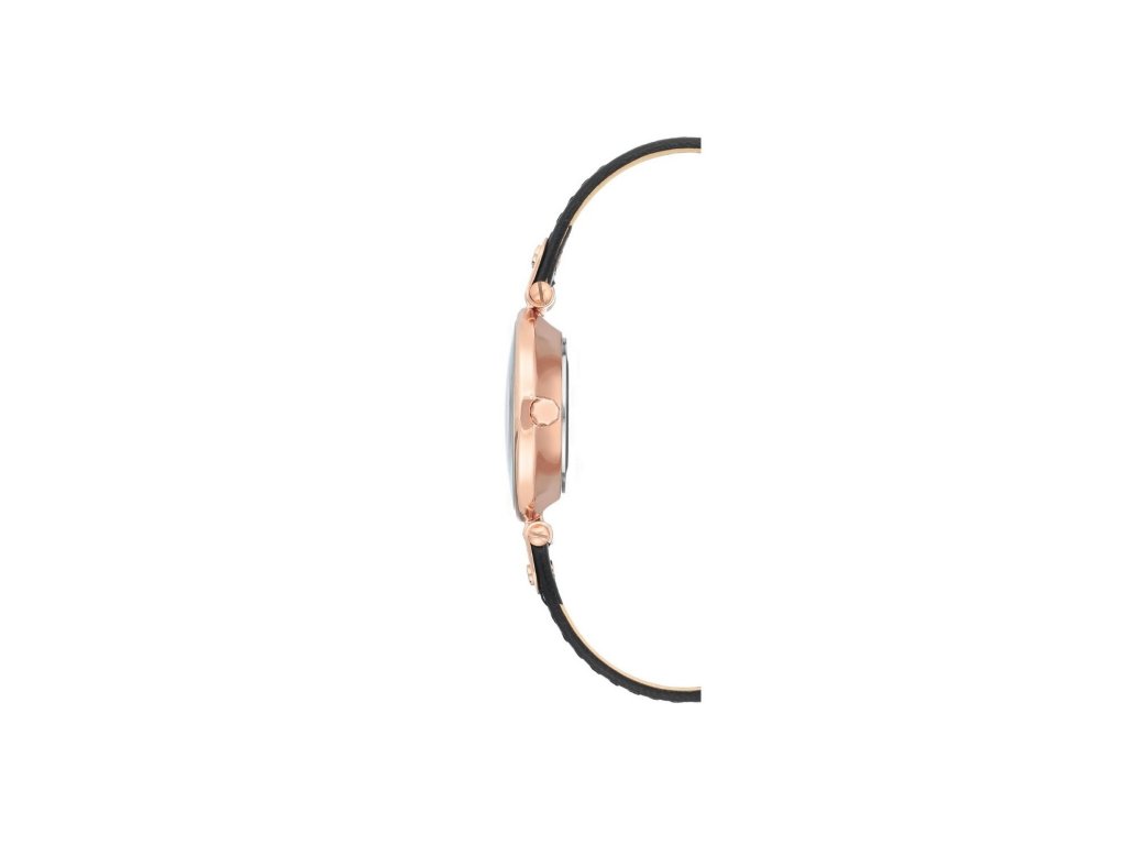 Elegantní hodinky s růžovozlatými detaily a černým koženým páskem. Značka Anne Klein, nesoucí jméno známé americké vizionářky, přináší všem ženám možnost sebevyjádření pomocí něčeho tak praktického, jako jsou hodinky. Kulatý bílý číselník s perleťovým efektem zdobí indexy v podobě římských číslic. Celek dotváří kovové růžovozlaté pouzdro o rozměru 30 mm a černý kožený pásek zakonečný klenotnickou sponou. Ochranu hodinek zajišťuje vysoce odolné minerální sklo.Doplňkové parametry