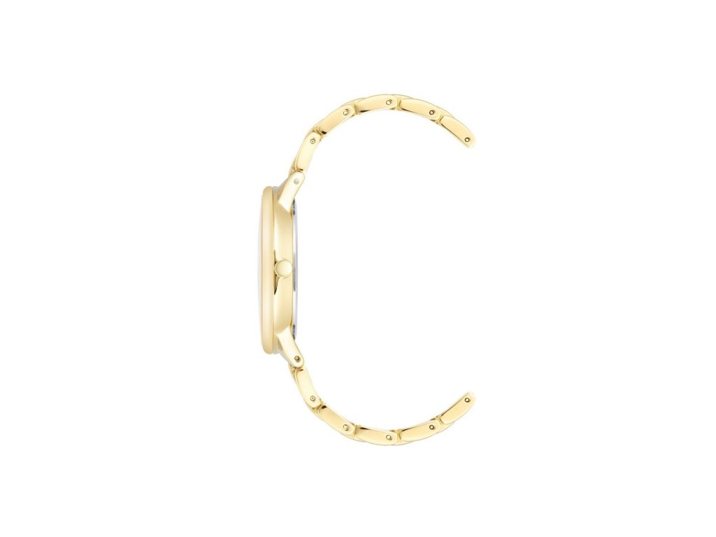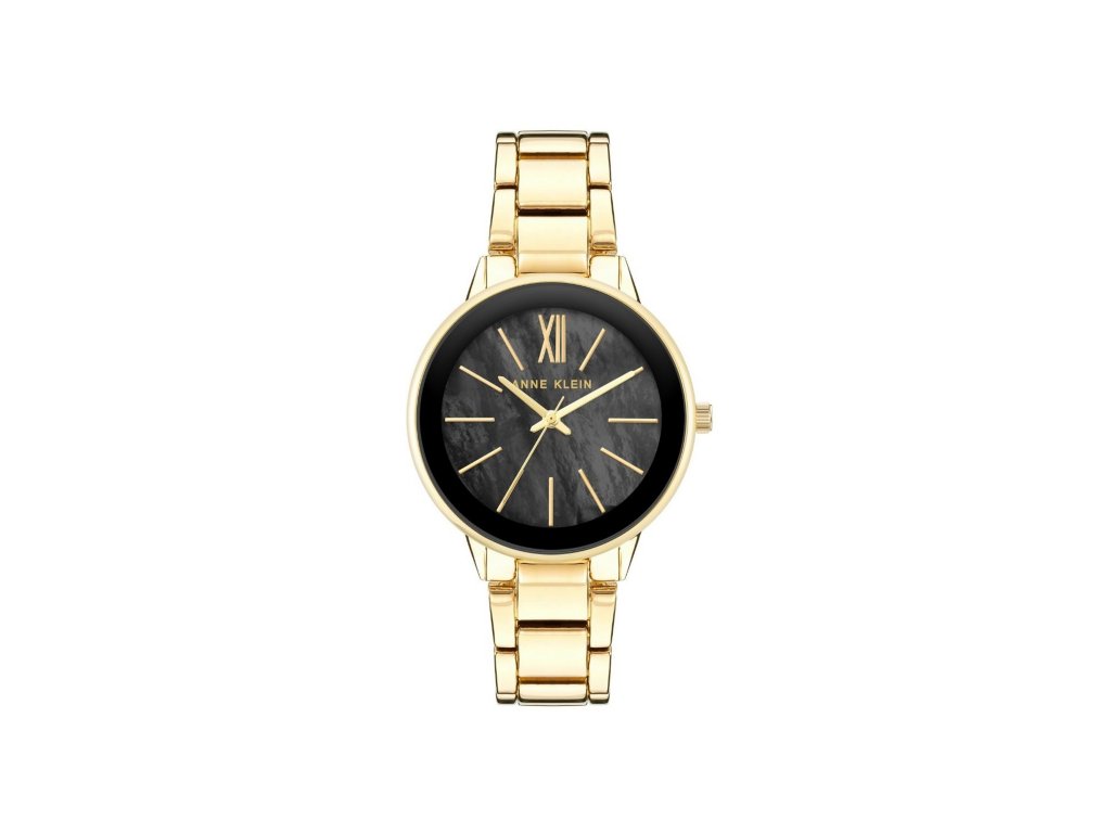 Stylové hodinky s kovovým páskem a perleťovým detailem. Značka Anne Klein, nesoucí jméno známé americké vizionářky, přináší všem ženám možnost sebevyjádření pomocí něčeho tak praktického, jako jsou hodinky. Černý číselník s perleťovým efektem doplňují zlaté indexy v podobě tyčinek a římských číslic. Efektní kontrast tvoří pozlacený kovový pásek. Hodinky ochraňuje minerální sklo a pouzdro o rozměru 37 mm. Snadné zapínání zajišťuje klenotnická přezka.Doplňkové parametry