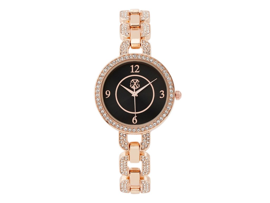 Model je vybaven přesným strojkem Quartz a chráněn minerálním sklem. Kovový tah v růžovozlaté barvě zdobený krystaly ladí s kulatým pouzdrem v témže tónu, které podtrhuje celkově jemně luxusní charakter. Černý číselník zvýrazňuje elegantní kontrast a dodává modelu sofistikovaný vzhled, díky němuž hodinky působí jako skutečný módní šperk.