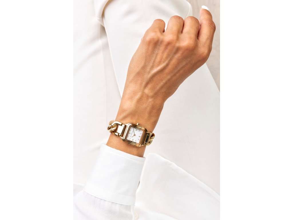 Robustní ocelový tah ve zlaté barvě připomíná šperkový náramek a vytváří kontrast k minimalistickému číselníku v bílé barvě. Čistý číselník bez rušivých prvků podtrhuje sofistikovaný vzhled modelu, zatímco hranaté pouzdro ve zlatém tónu dodává moderní geometrii a lehkost. Minerální sklo chrání celý design před poškozením a zajišťuje dlouhou životnost. Výsledkem je elegantní módní doplněk, který propojuje styl a funkčnost v dokonalé rovnováze.