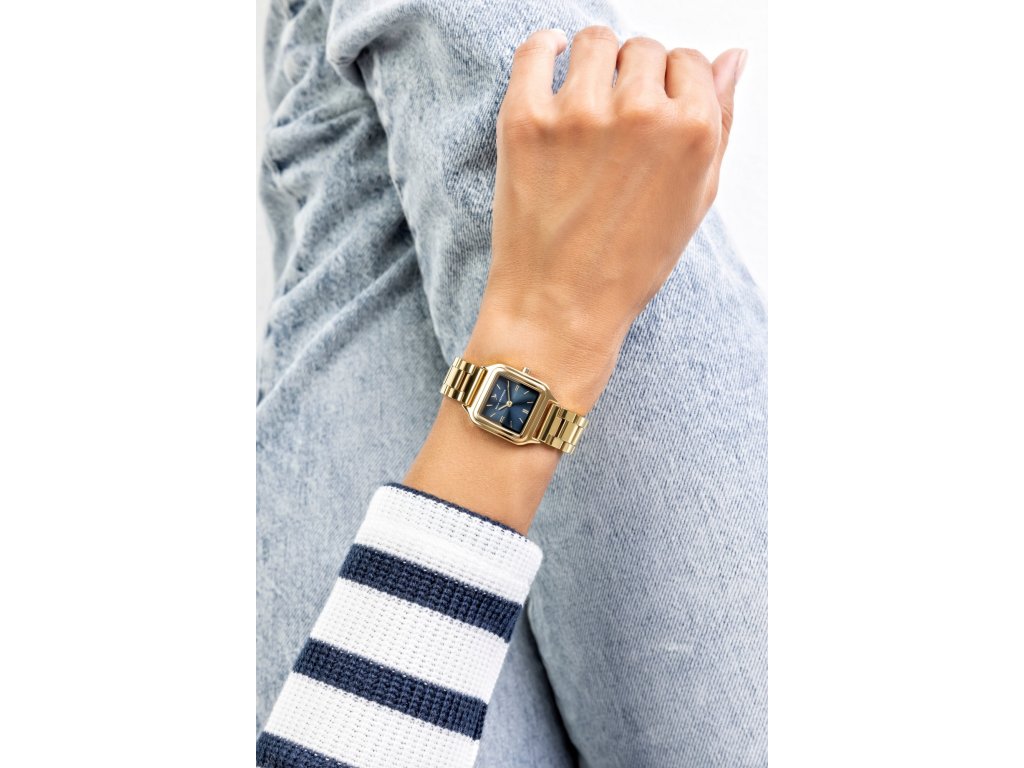 Číselník v tmavě modré barvě dodává hodinkám hloubku a vytváří jemný kontrast k ocelovému tahu ve zlaté barvě. Pouzdro ve zlatém tónu elegantně doplňuje celý design a podtrhuje ženský charakter modelu. Minerální sklo chrání číselník před poškrábáním, takže hodinky zůstávají krásné i při každodenním nošení. Výsledkem je doplněk, který působí klidně, ale přitom nezanikne.