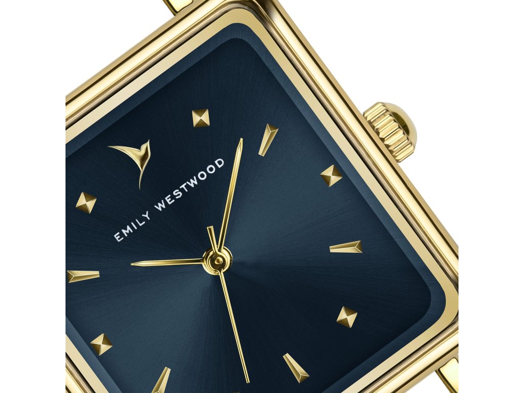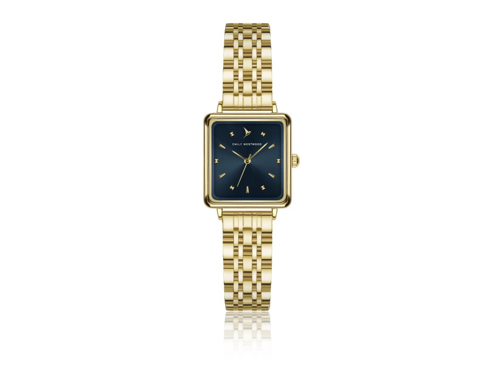 Výrazná modrá v zlatém rámci. Dámské hodinky Emily Westwood Patricia zaujmou kombinací hluboké modré a elegantního zlata. Hranaté pouzdro dodává modelu moderní geometrii, zatímco jemné detaily podtrhují ženský charakter hodinek.