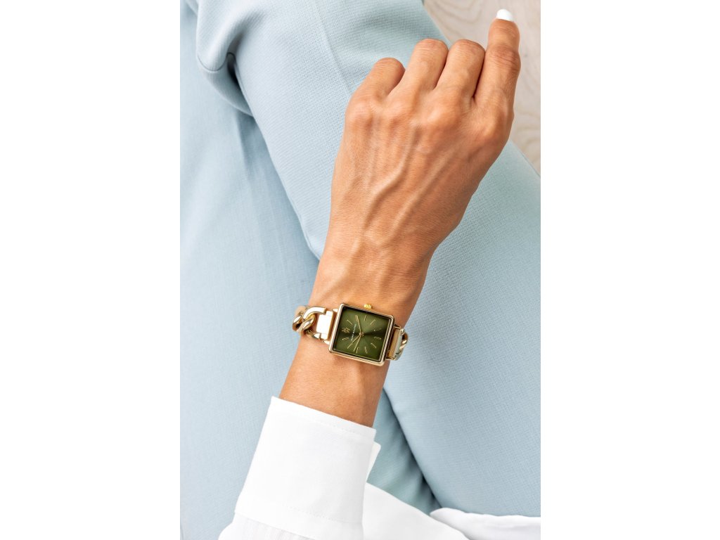 Zelený číselník v hranatém tvaru krásně kontrastuje s ocelovým tahem ve zlaté barvě, který působí elegantně a nadčasově. Pouzdro ve zlatém tónu vytváří harmonii celého designu a dodává hodinkám sofistikovaný vzhled. Minerální sklo chrání číselník při každodenním nošení. Tento model je ideální pro ženy, které chtějí spojit jednoduchost s jemným barevným akcentem.