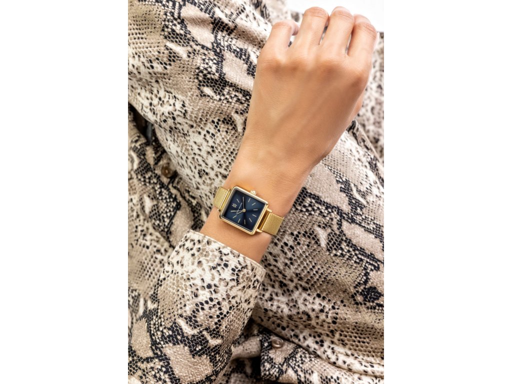 Modrý číselník v hranatém tvaru krásně vyniká v kombinaci s ocelovým tahem ve zlaté barvě, který působí luxusně a nadčasově. Pouzdro ve zlatém tónu harmonicky doplňuje celý design a zvýrazňuje barevný kontrast. Minerální sklo chrání číselník při každodenním nošení. Tento model je ideální pro ženy, které chtějí propojit klasickou eleganci se svěžím barevným akcentem.