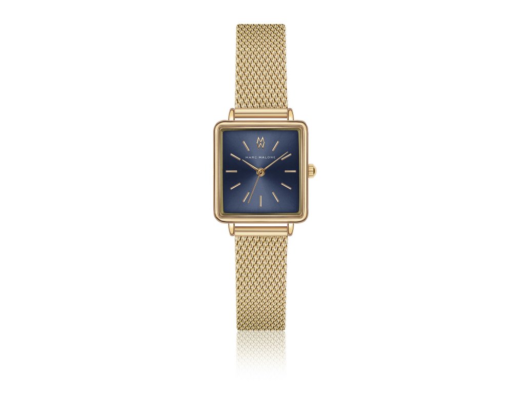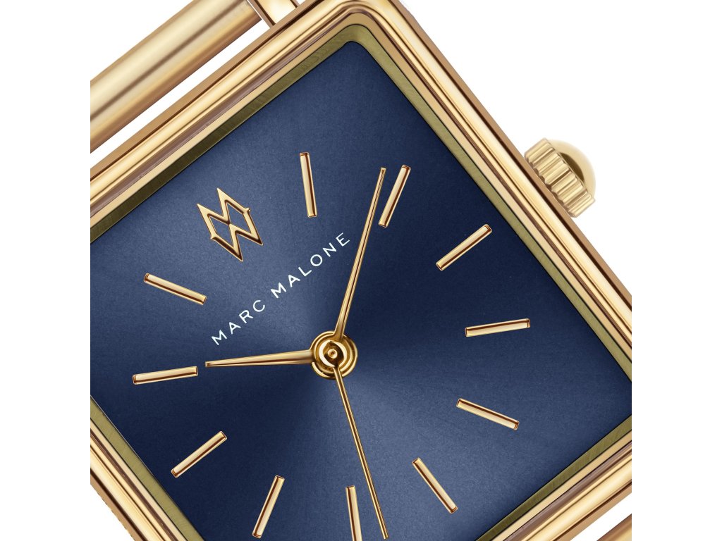 Výrazná modrá a elegance zlata. Dámské hodinky Marc Malone CDS-3414 zaujmou kontrastem hlubokého modrého číselníku a teplého zlatého provedení. Hranaté pouzdro dodává modelu moderní tvar a podtrhuje jeho sofistikovaný vzhled.