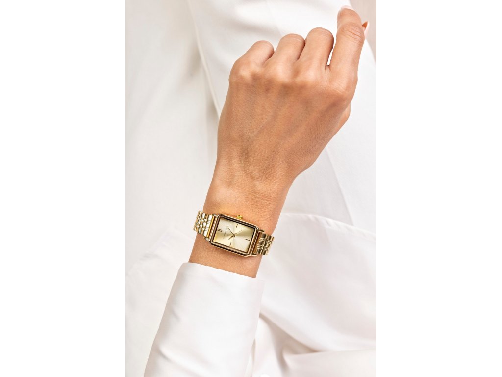 Zlatý číselník v hranatém tvaru dokonale ladí s ocelovým tahem ve zlaté barvě a pouzdrem ve zlatém tónu, čímž vzniká harmonický a vyvážený celek. Minerální sklo spolehlivě chrání číselník při běžném používání. Tyto hodinky jsou perfektní volbou pro ženy, které hledají doplněk v jednotném zlatém provedení s moderním tvarem.
