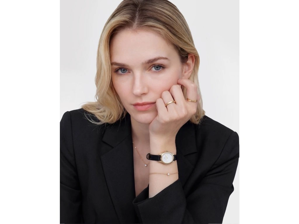 Model doplňuje černý kožený řemínek s embosovaným vzorem ještěrky, který přidává jemnou texturu a zároveň podtrhuje klasickou eleganci hodinek.