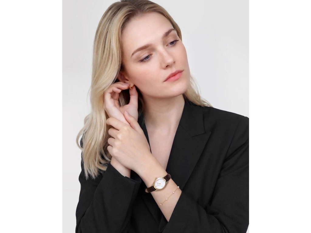 Dámské hodinky Daniel Wellington Juliette přinášejí jemnou interpretaci klasického šperkového designu s elegantním oválným pouzdrem. Nadčasový model, který propojuje minimalistickou skandinávskou estetiku s vytříbeným stylem, zaujme bílým číselníkem, oválným pouzdrem ve zlaté barvě a tmavě hnědým koženým řemínkem se vzorem ještěrky.