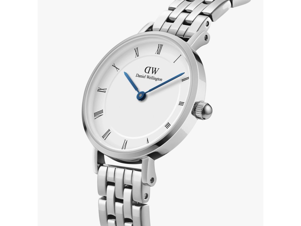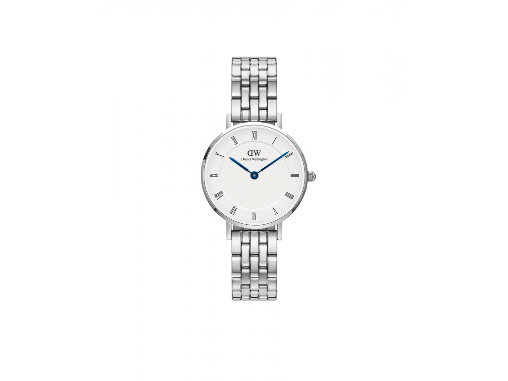 Dámské hodinky Petite Roman Numerals 5—Link Silver od značky Daniel Wellington upoutají ledově krásnou barevnou kombinací bílého číselníku, stříbrného provedení pouzdra a královsky modrých ručiček.