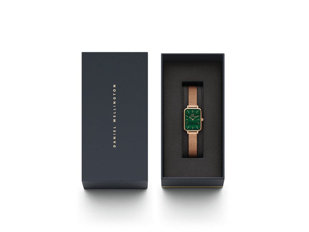 Výrazný zelený číselník v kombinaci se síťovaným mesh kovovým řemínkem. To jsou hodinky Quadro Pressed Melrose, první hodinky s hranatým číselníkem značky Daniel Wellington. Vyrobeny z leštěné nerezové oceli v tónech růžového zlata. Čistý design hodinek doplňuje elegantní pouzdro o rozměrech 20x26 mm.Doplňkové parametry