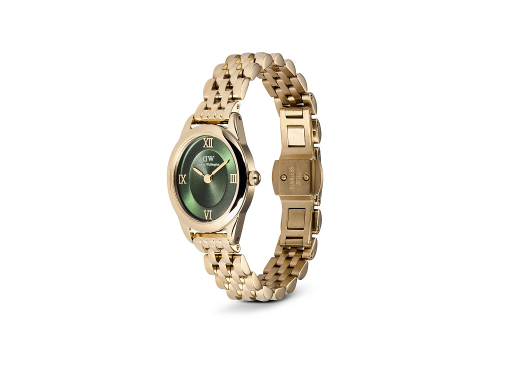Jemné linie, kompaktní velikost a neotřelá barevná kombinace zlaté a smaragdově zelené dělají z hodinek perfektní doplněk pro minimalistický styl.