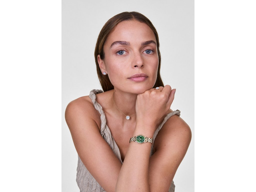 Římské číslice zdobí zelený číselník se sunray efektem. Jemné paprskovité odlesky reagují na světlo a dodávají číselníku hloubku a sofistikovaný vzhled. Oválné pouzdro i ocelový tah mají elegantní zlatý tón s hladkým, leštěným povrchem. Zapínání s motýlovou sponou dokonale splývá s celkovým designem a zajišťuje pohodlné nošení.