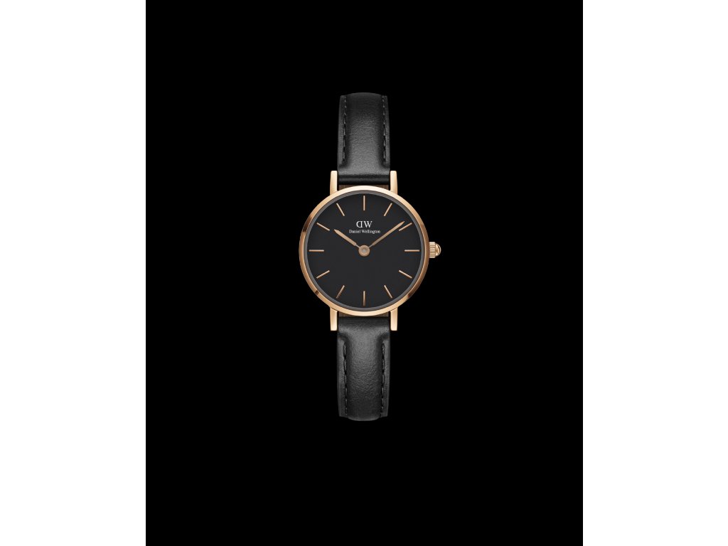 Jemné dámské náramkové hodinky s pouzdrem v růžovozlaté barvě, černým číselníkem a černým koženým páskemDoplňkové parametry