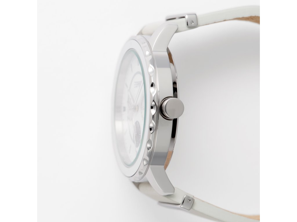 Velkému číselníku bílé barvy o průměru 40 mm dominují chronograf, datumovka, jednoduché indexy a moderní ručky. Vsazen je do kulatého pouzdra z nerezové oceli stříbrné barvy, které velmi pěkně ladí s koženým řemínkem šedé barvy. Celková kombinace působí stylově a nadčasově.