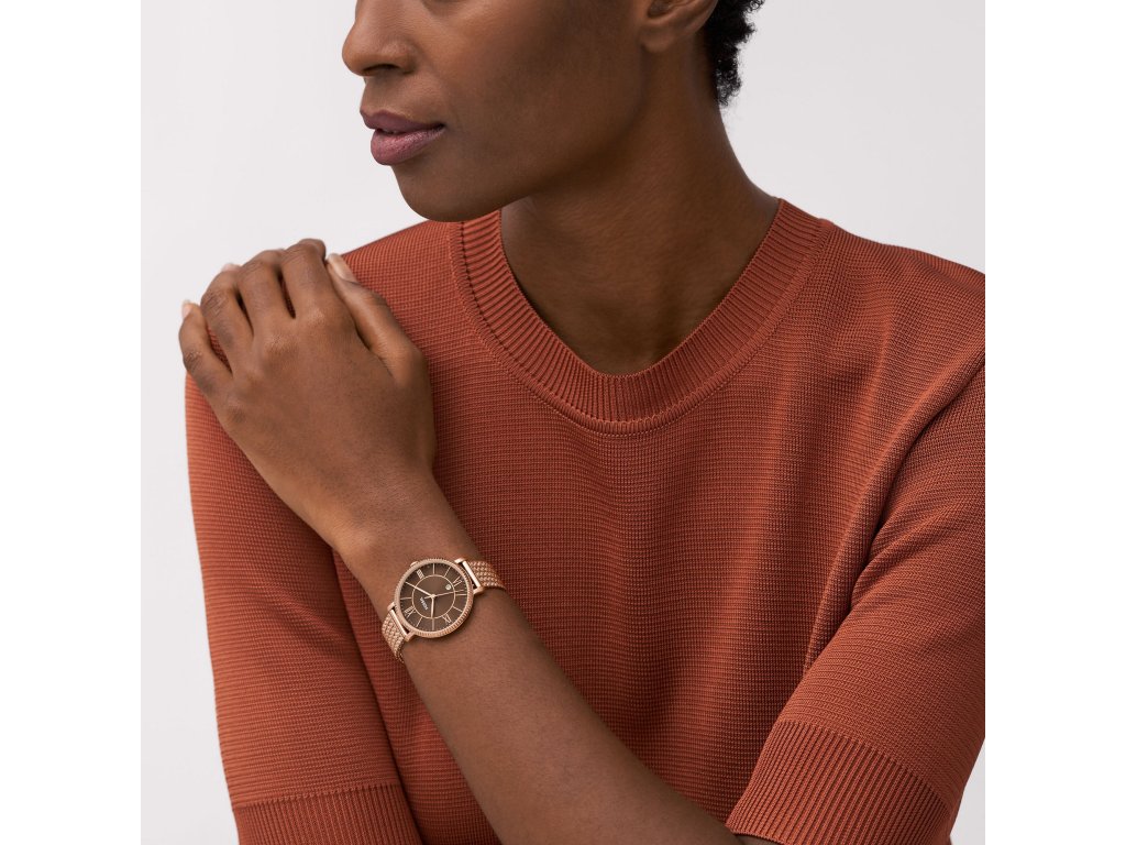 Na větším číselníku o průměru 36 mm hnědé barvy vynikají elegantní ručky a indexy v růžovozlatém provedení. Příjemným bonusem je datumovka. Kulaté pouzdro z nerezové oceli stejné barvy poté velmi pěkně ladí s růžovozlatým mesh ocelovým tahem. Tyto hodinky jsou tak doslova klenotem, který pozdvihne váš outfit na úplně jinou úroveň.