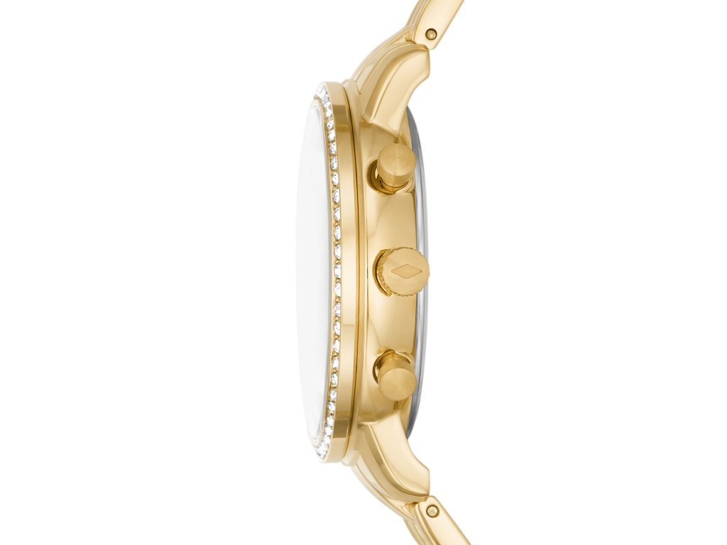 V moderním číselníku o průměru 36 mm vyniká chronograf, datumovka a drobné logo značky. Číselník je zasazen do kulatého pouzdra, jenž je osázeno drobnými krystaly. K celému tomuto doplňku poté skvěle pasuje tah složený z ocelových článků.