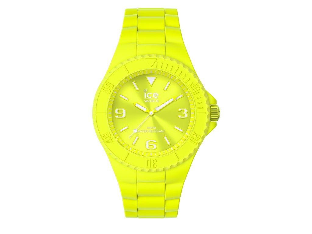 Pánské náramkové hodinky se silikonovým popruhem v honosné žluté barvě a číselníkem, který kombinuje indexy a číslice.