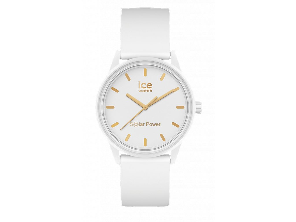 Dámské hodinky poháněné solární energií bílé barvy a číselníkem s indexy a ručičkami zlaté barvy.