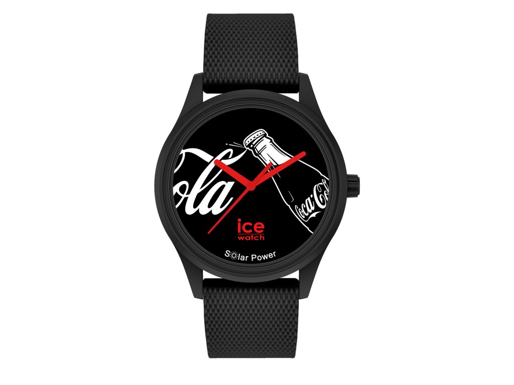 Hodinky v černém provedení s motivem Coca-Cola na číselníku, poháněné solární energií.