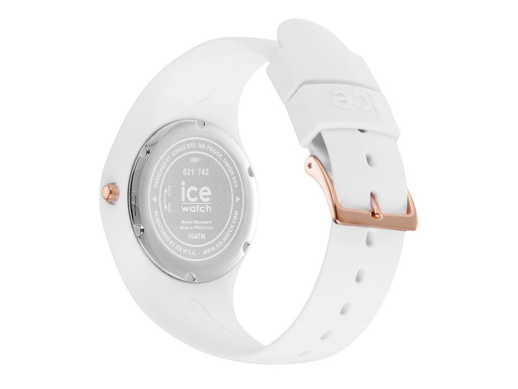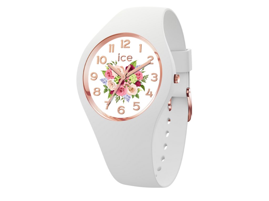 Model ICE Flower White Bouquet zaujme svým jemným designem. Jejich bílé provedení doplňují růže na číselníku a růžovozlaté detaily, přidávající doplňku romantický nádech.