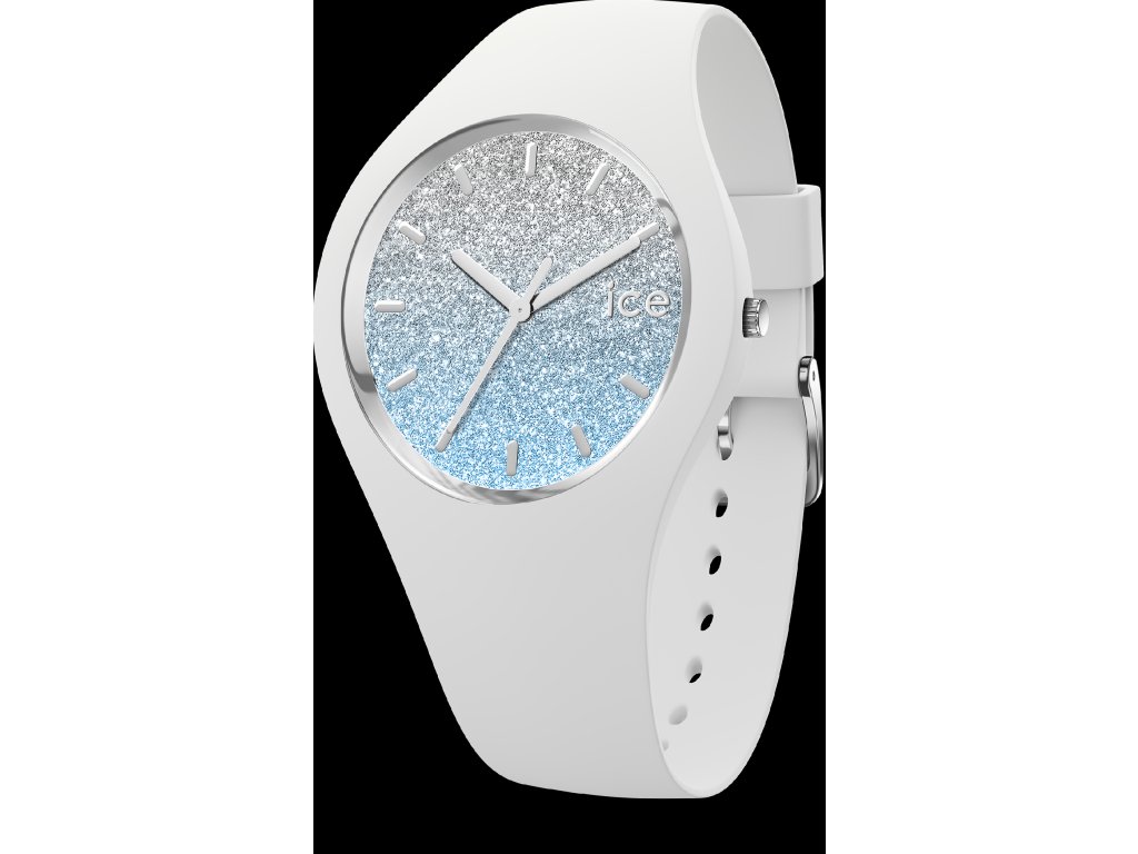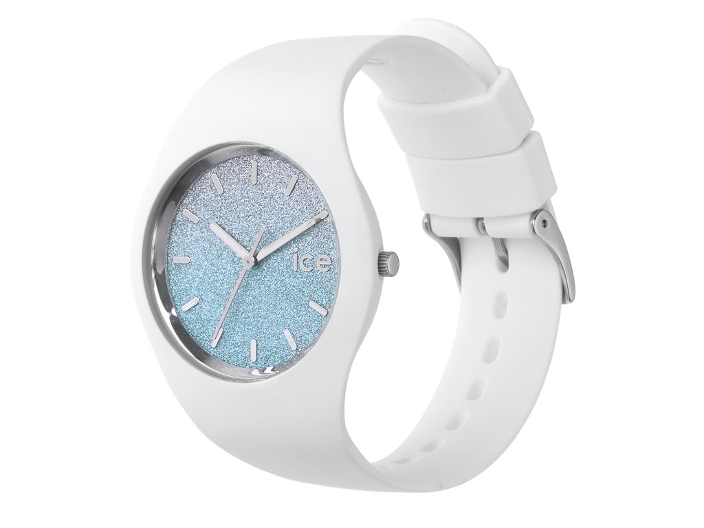 Módní dámské hodinky v bílém provedení se třpytivým číselníkem stříbrné a modré barvy se stříbrnými doplňky.Doplňkové parametry
