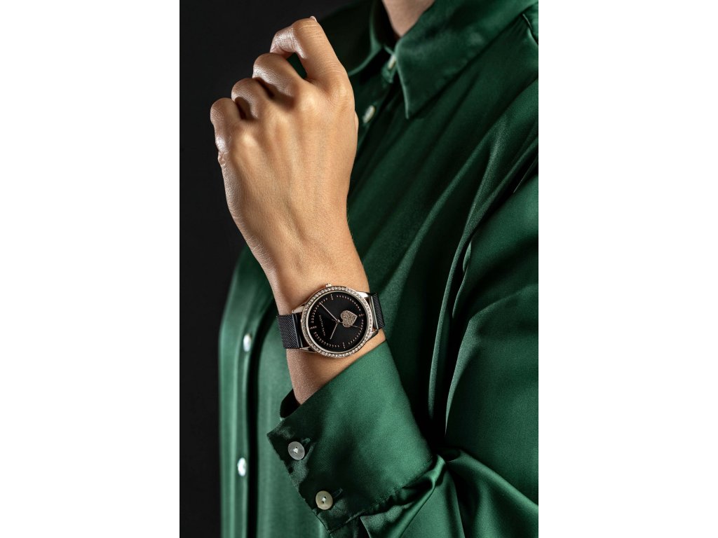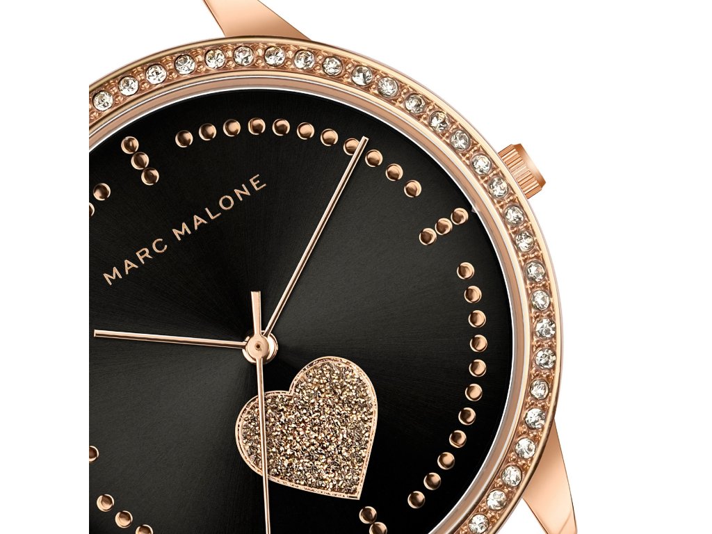Dámské hodinky značky Marc Malone Alice Black Mesh mají kovový strukturovaný řemínek v minimalistické černé barvě. Číselník je doplněný drobnými kamínky v kontrastní, růžovo zlaté barvě. Číselník je zdoben motivem srdce, které je také vyskládáno z těchto jemných kamínků. Číselník o průměru 38 mm je chráněn minerálním sklíčkem. Kovový řemínek je široký 18 mm a opatřený černou kovovou sponou.Doplňkové parametry