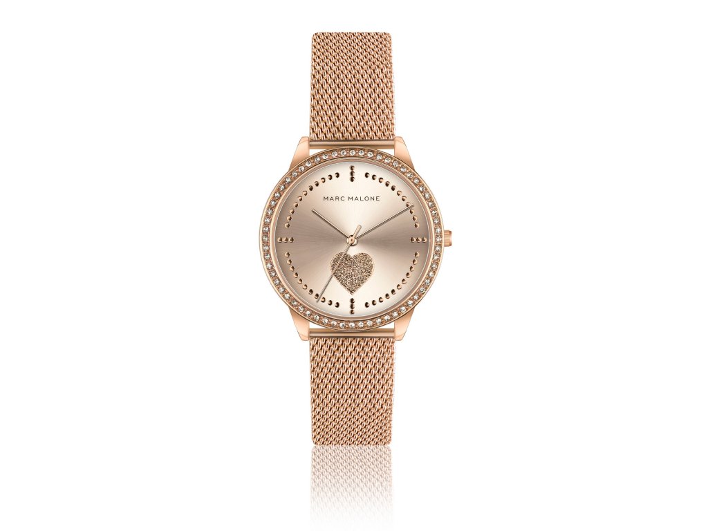 Dámské hodinky značky Marc Malone Doris Rose Gold Mesh mají kovový strukturovaný řemínek v barvě růžového zlata. Číselník je doplněný drobnými kamínky v kontrastní, stříbrné barvě. Číselník je zdoben motivem srdce, které je také vyskládáno z těchto jemných kamínků. Číselník o průměru 38 mm je chráněn minerálním sklíčkem. Kovový řemínek je široký 18 mm a opatřený růžově zlatou kovovou sponou.Doplňkové parametry