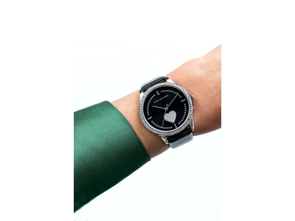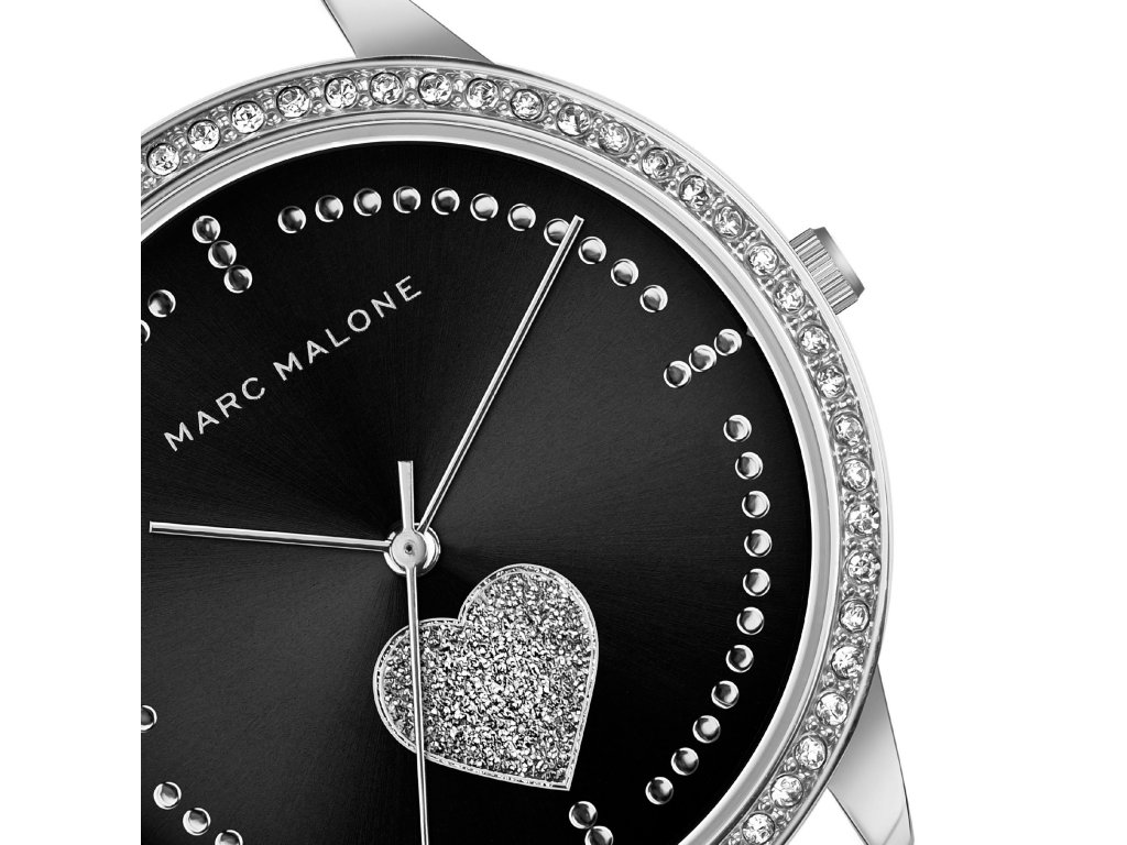 Dámské hodinky značky Marc Malone Madison Lizard Black Leather mají plastický kožený řemínek černé barvy. Číselník černé barvy je doplněný dorbnými kamínky v kontrastní, stříbrné barvě. Číselník je zdoben motivem srdce, které je také vyskládáno z těchto jemných kamínků. Číselník o průměru 38 mm je chráněn minerálním sklíčkem. Kožený řemínek je široký 18 mm a opatřený stříbrnou kovovou sponou.Doplňkové parametry