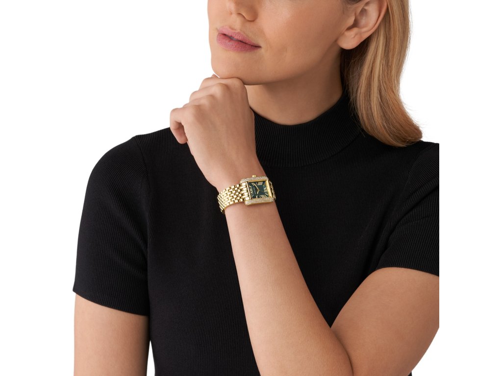 Číselník smaragdově zelené barvy, zasazený do hranatého pouzdra zdobeného hned třemi řadami třpytivých krystalů, vypadá originálně a na ruce vyniká. Stejně tak půvabně vypadají tři zlatavé ručky a indexy. V kombinaci s tahem z ušlechtilé oceli zlaté barvy poté společně tyto komponenty tvoří designový doplněk, který podtrhne vaši ženskost.