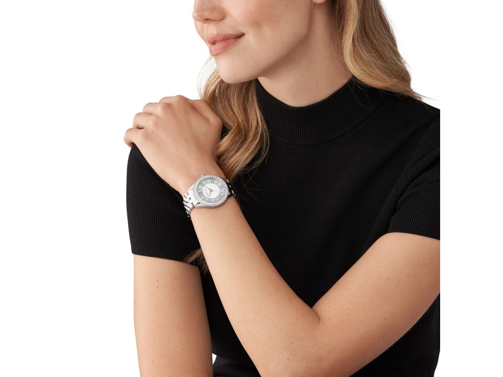 Masivní kulaté pouzdro stříbrné barvy z oceli zdobené krystaly vytváří s bílým číselníkem o průměru 38 mm též lemovaným třpytivými krystaly jedinečné spojení. Velmi pěkně poté s pouzdrem a číselníkem ladí také útlé stříbřité ručičky a indexy stejné barvy. Tah z ušlechtilé oceli dodává hodinkám moderní nádech.