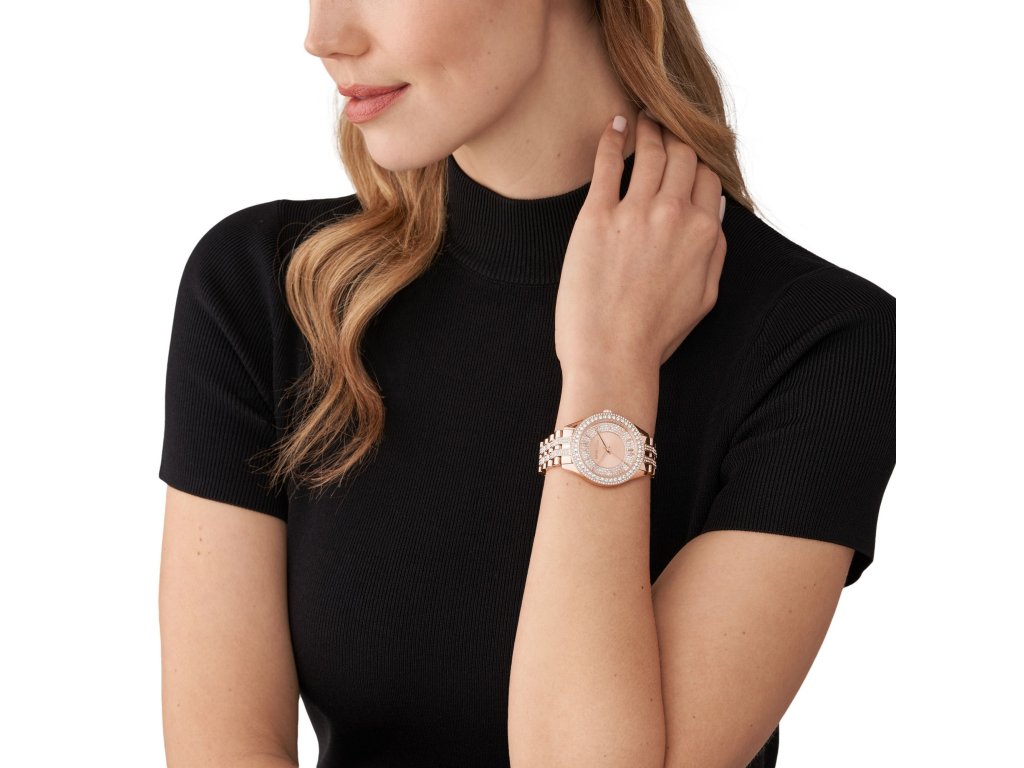 Zaujměte s těmito exkluzivními dámskými hodinkami od Michael Kors. Působivá kombinace číselníku růžovozlaté barvy a krystalů dodává hodinkám nádech luxusu a jemné elegance. Tento módní kousek je dokonalým spojením vkusu, stylu a nápaditosti, který oceníte v práci, při jednání i na rande.