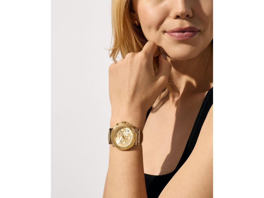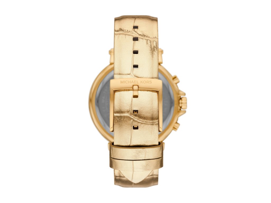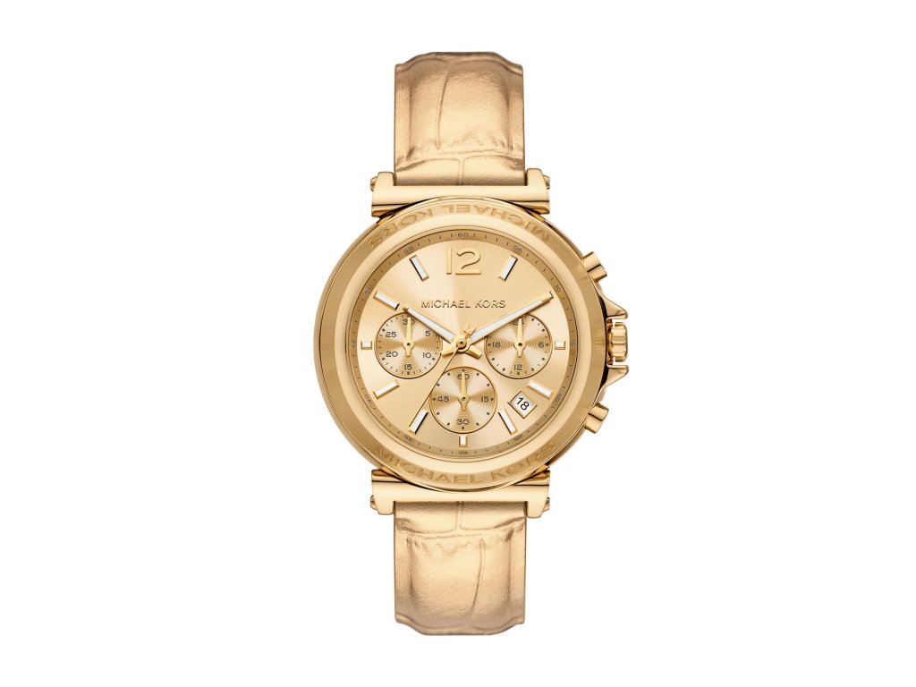 Dámské hodinky Michael Kors Maren v sobě spojují sportovně-elegantní design s luxusním vzhledem. Zlatý kožený řemínek, jemně třpytivý číselník a chronograf dělají z tohoto modelu ideální doplněk pro ženy, které chtějí být šik od rána do večera – a přitom neztrácet přehled o čase.