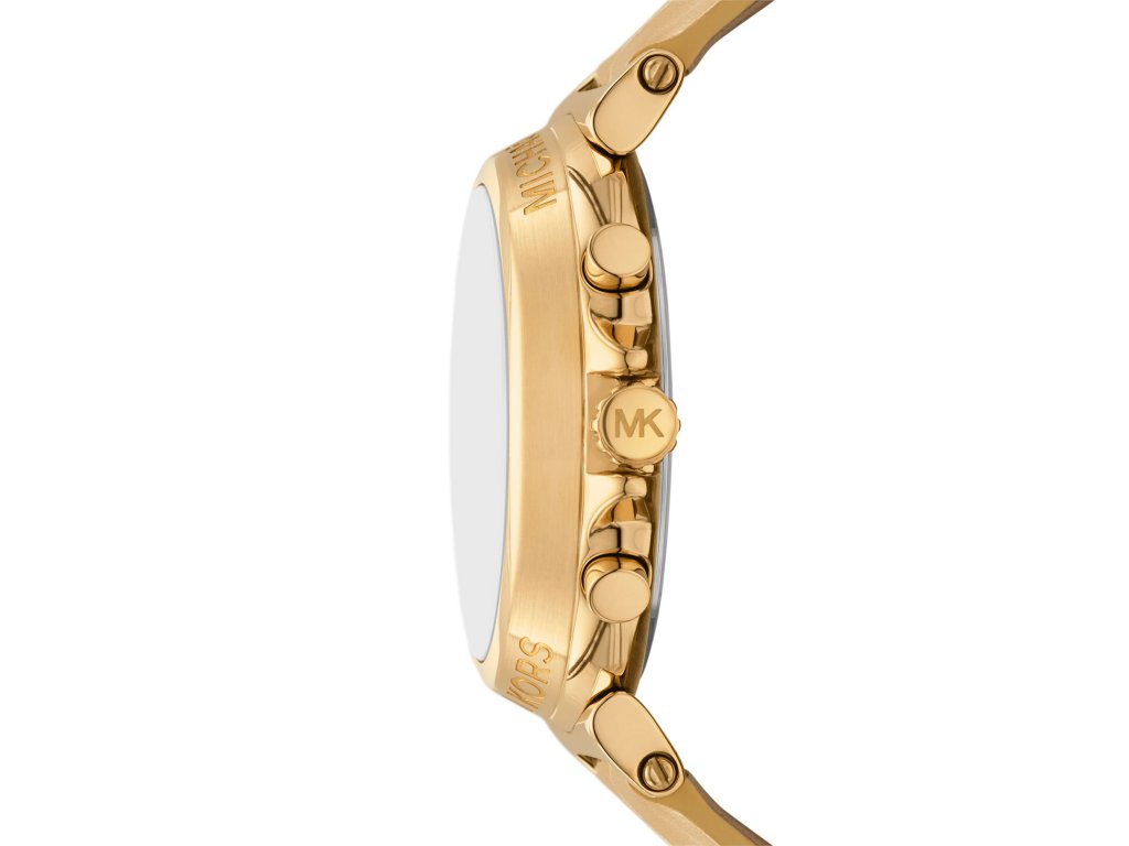 Model MK7508 je vybaven zlatým koženým řemínkem, kulatým pouzdrem ve zlatém tónu a číselníkem o průměru 40 mm. Funkční chronograf a datumovka doplňují stylově čistý vzhled. Celek chrání minerální sklo a pohání spolehlivý strojek Quartz.