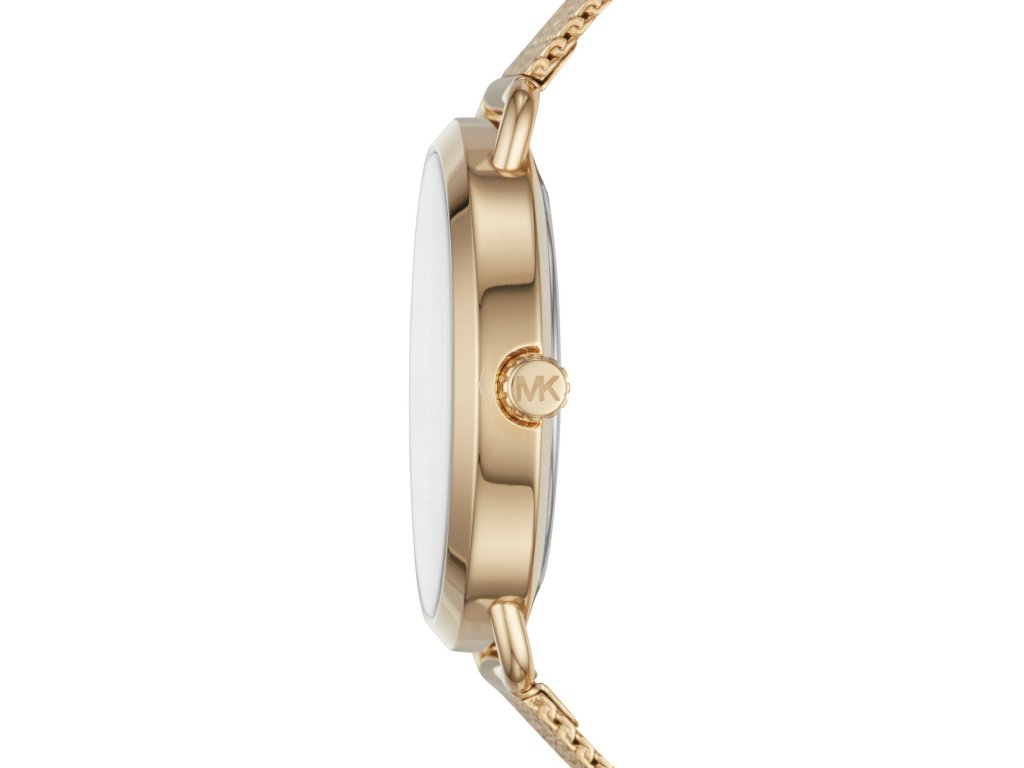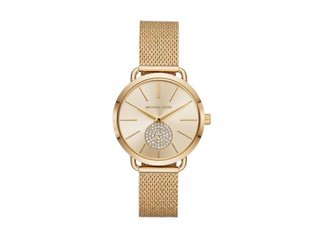Minimalistické hodinky Portia ve zlaté barvě se zářícími krystaly od Michael Kors se zaručeně stanou středem pozornosti.